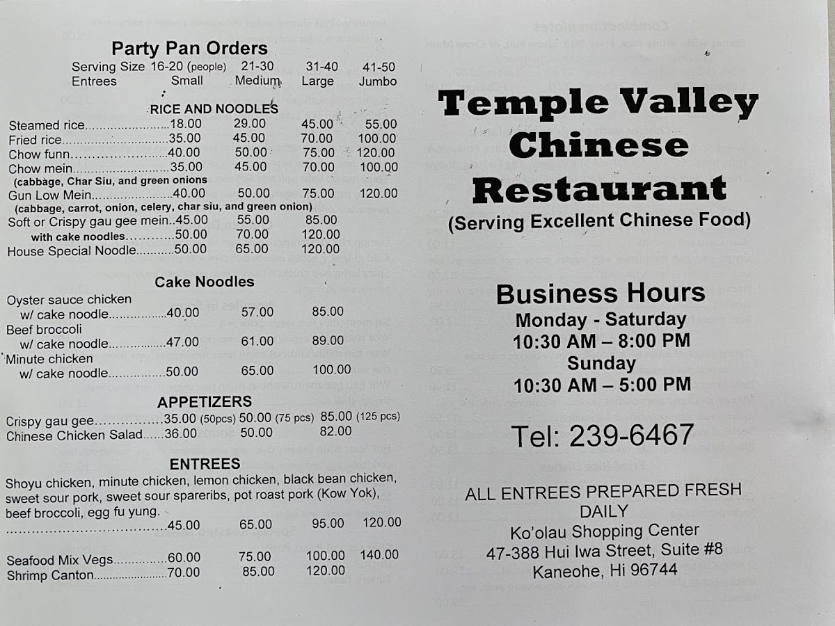 The menu also caters well to groups with generous Party Pans, featuring items like Crab Rangoon, Oyster Sauce Cake Noodle, Chow Mein, Beef Broccoli Cake Noodle, and Crispy Gau Gee, as well as entrée-sized pans including Shoyu Chicken, Minute Chicken, Roast Pork, Sweet Sour Pork, and Black Pepper Shrimp. Noodle lovers will appreciate options such as Soft Gau Gee Mein, Gon Lo Mein, Beef Chow Fun, and Black Bean Sauce Chow Fun, alongside comforting Noodle in Soup choices like Wonton Mein, Roast Duck Mein, and Wor Wonton Mein. Classic dishes like Egg Foo Young With Cabbage, Lemon Chicken, Stuffed Eggplant, and a full range of Fried Rice-from Vegetable Fried Rice to Char Siu Fried Rice-complete the savory offerings. To finish, drinks such as Vietnamese Iced Coffee, Plantation Iced Tea, Fresh Lemon Iced Tea, Can Soda, and Blended Bubbles Tea (Small) provide refreshing balance. Overall, the menu feels comprehensive and reliable, making Temple Valley Chinese Restaurant a solid choice for both casual meals and celebratory feasts.